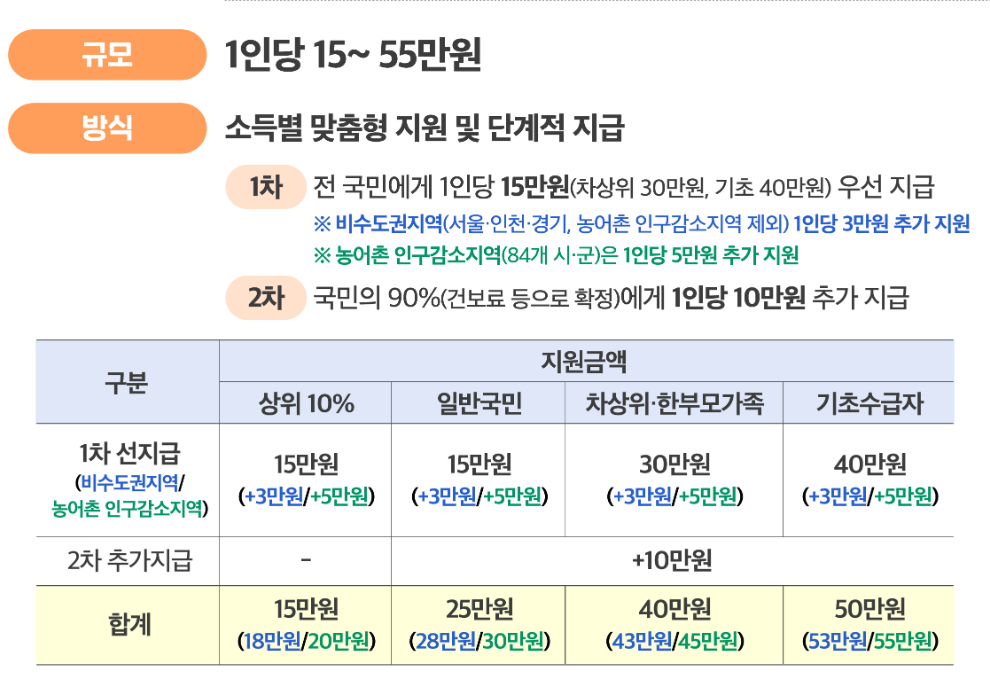 특히 2차 지급은 소득 상위 10%를 제외한 전국민 90%를 대상으로 하며, 추가로 1인당 10만 원이 지급되는 만큼, 이번 기회를 놓치지 않는 것이 중요합니다.